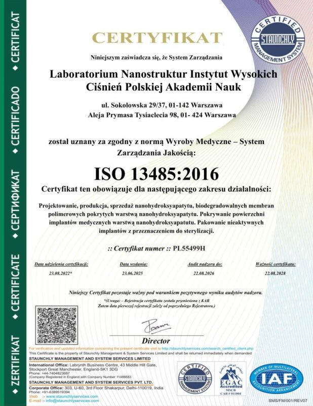 Instytut Wysokich Ciśnień Polskiej Akademii Nauk (IWC PAN) ma przyjemność ogłosić, że Laboratorium Nanostruktur zdobyło certyfikat (nr PL55499H) zgodności z normą medyczną ISO 13485 na wytwarzanie innowacyjnych wyrobów w postaci nanoproszku hydroksyapatytu do przyśpieszonej regeneracji tkanki kostnej oraz biodegradowalnych membran separacyjnych pokrytych warstwą nanohydroksyapatytu!